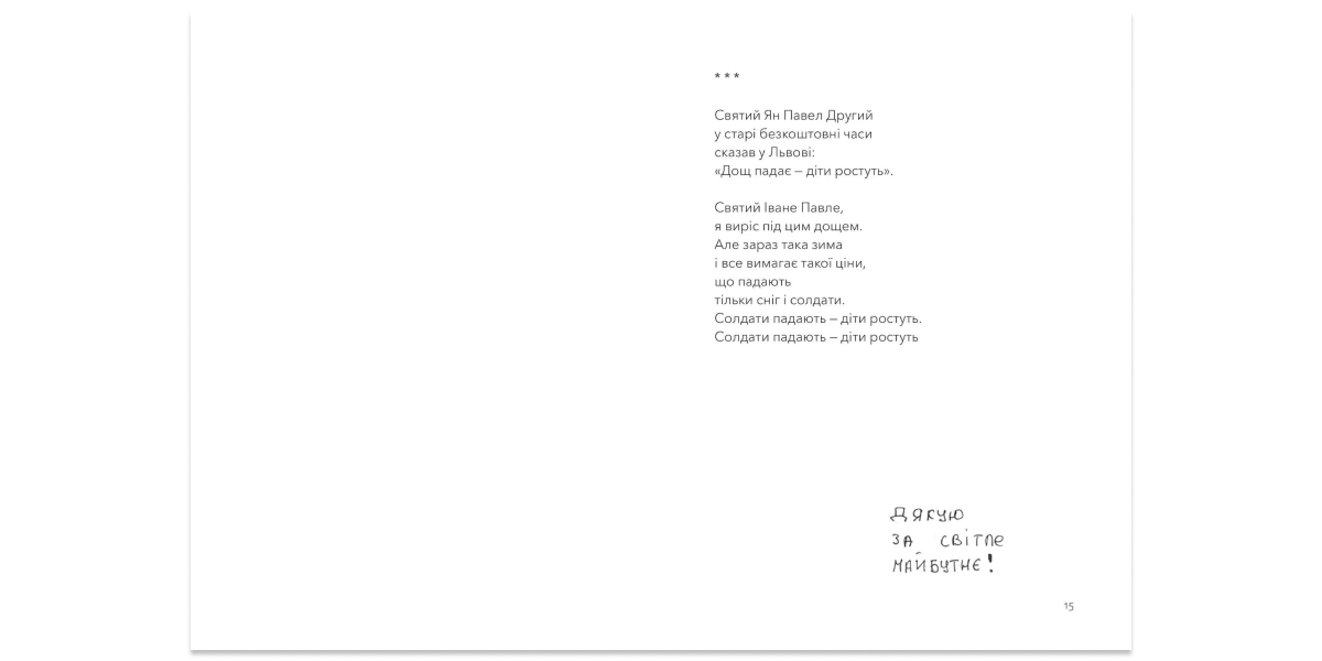 У 2001 році в Україну з візитом прибув Папа Іван Павло ІІ. Це була особливо важлива подія в регіонах, де найбільш поширеною є греко-католицька церква, бо папа був людиною, яка допомогла цій церкві повернути собі легальний статус після десятиліть радянських репресій. В останній день року, що передував тій події, народився Артур Дронь, поет, сьогодні двадцятитрирічний військовослужбовець з біблійним позивним «Давид», чия друга поетична книжка «Тут були ми» наприкінці 2023 року вийшла у «Видавництві Старого Лева». 50 віршів, оформлені ілюстраціями Катерини Сад і фрагментами листів, які діти надсилають солдатам на фронт. Книжка починається згадкою про візит Папи, який можна відтворити завдяки відео, на якому понтифік каже: «Дощ падає — діти ростуть». Сьогодні, говорить ліричний герой Артура Дроня, «солдати падають — діти ростуть», тобто змінилася система рівноваги світу.