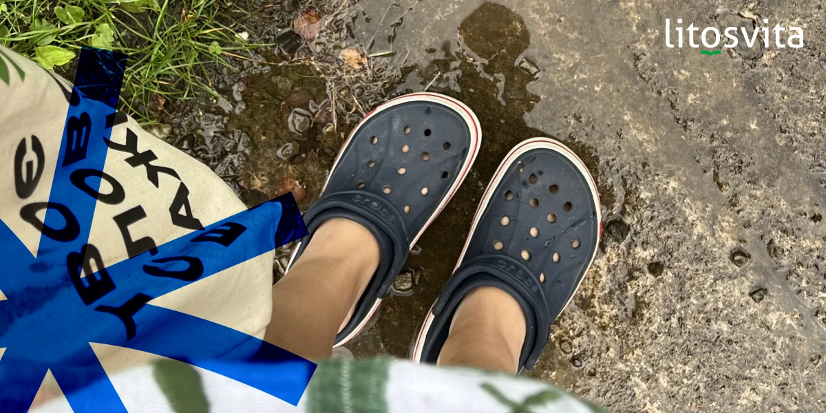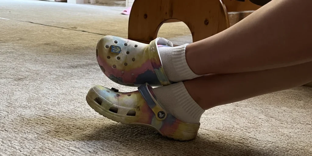 У моєї сусідки по кімнаті чарівні сандалі розміру так 35. Хай навіть я знайду такі ж самі на свій 39-й — ніхто й не подумає нас порівнювати. У колеги із групи крокси із принтом тай-дай, а мої — темно-сині. Наше взуття відрізняється й рівнем зношеності.
